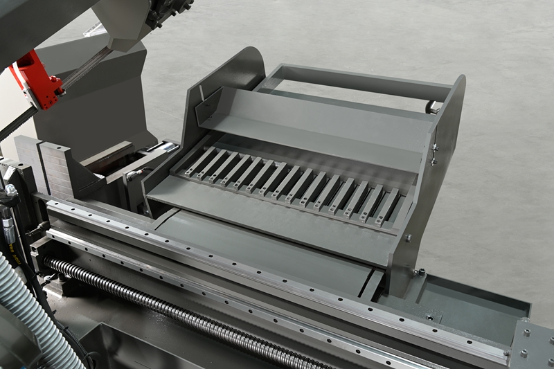 Thiết bị dẫn hướng được lắp đặt trên dầm khung cưa bao gồm các tay dẫn hướng trái và phải và các đầu dẫn hướng. Cả hai tay dẫn hướng bên trái và bên phải đều có thể di chuyển dọc theo đuôi khớp. Khoảng cách giữa hai tay dẫn hướng có thể được điều chỉnh rộng hơn khoảng 40mm. kích thước của phôi. Thiết bị dẫn hướng dùng để thay đổi góc lắp đặt lưỡi cưa sao cho lưỡi cưa vuông góc với bàn làm việc. Để đảm bảo độ chính xác khi cắt của lưỡi cưa và giảm độ rung, một bộ bánh xe dẫn hướng (vòng bi lăn) và. Khối dẫn hướng chống mài mòn được lắp đặt ở hai tay dẫn hướng bên trái và bên phải. Mặt sau của lưỡi cưa cũng có kết cấu ổ trục kép có thể xoay lên xuống phù hợp.