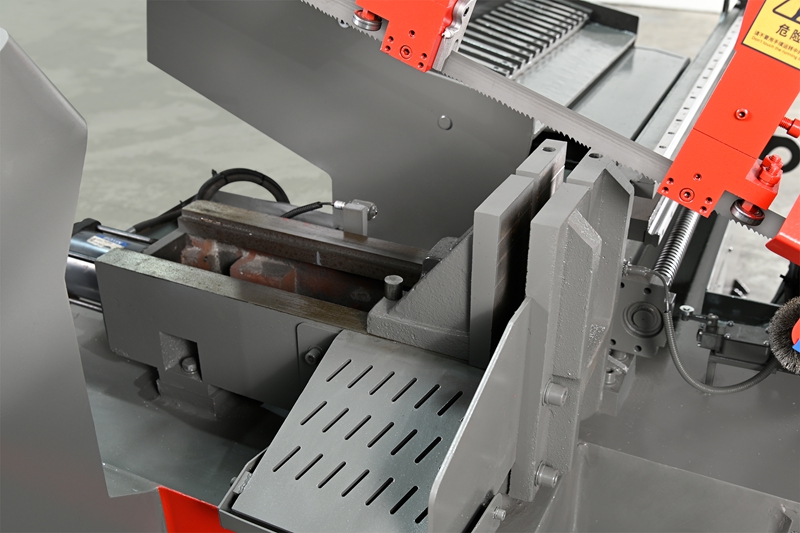 Cơ cấu kẹp sử dụng cấu trúc kẹp kiểu giữa. Lưỡi cưa vòng được cắt từ giữa êtô kẹp. Cơ cấu kẹp kiểu giữa hoàn toàn có thể đảm bảo độ ổn định của kẹp vật liệu và có thể kẹp các mảnh vật liệu đuôi nhỏ để cưa. Xi lanh kẹp vít quay tay, kích thước kẹp tối thiểu là 10 mm.